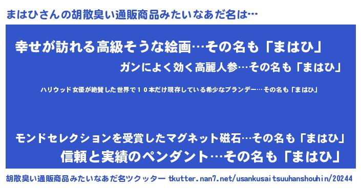 | 意味不明あだ名 | 『住所不定無職まはひ(81歳)』『自称まはひ』 |