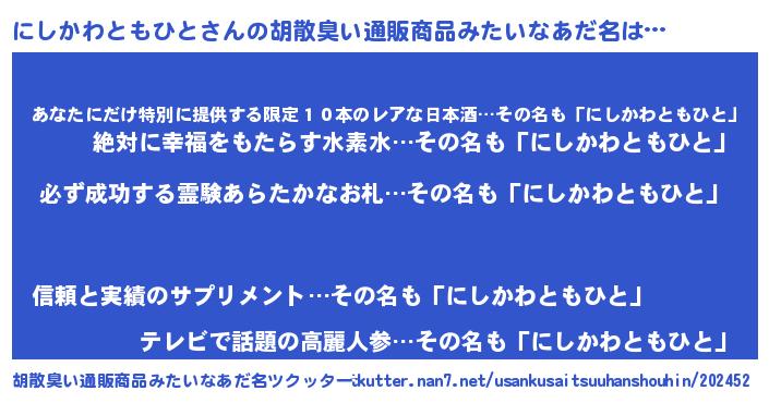 | ヘコむあだ名 | 『にしっふぃ~』『にしかわともひと(笑)』 |