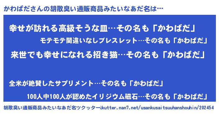 | ヒーロー風カッコイイあだ名 | 『ネオカワバダ』『ウルトラかわばだマン』 |