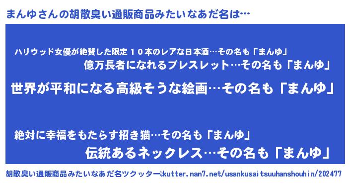 | 女子向けラノベタイトル風あだ名 | 『まんゆ伯爵の花嫁』『まんゆ様がみてる』 |