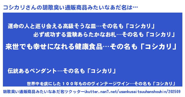 | ヒーロー風カッコイイあだ名 | 『ネオコシカリ』『ウルトラコシカリマン』 |