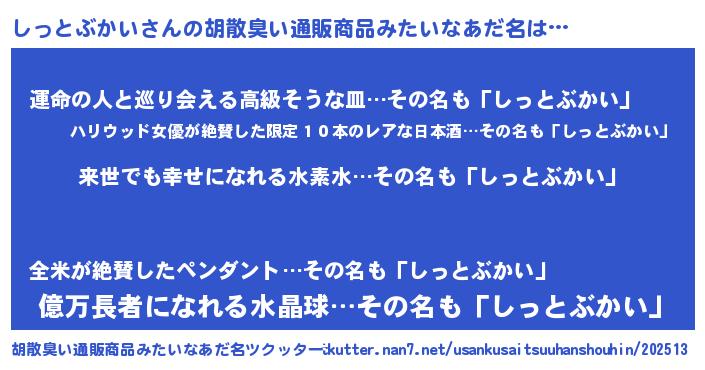 | 男性向けラノベタイトル風あだ名 | 『しっとぶかいに滅ぼされるだけの簡単なお仕事です』 |