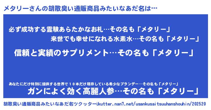 | ヘコむあだ名 | 『メタお』『メタもー』『牛乳』 |