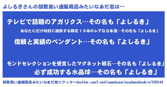 | 欧米人風あだ名 | 『よしるき・ステッグマイヤー』 |
