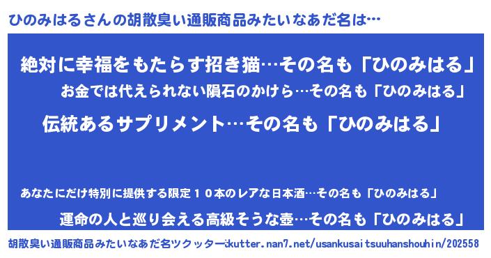 | 男性向けラノベタイトル風あだ名 | 『ひのみはるの嫁は女の子じゃないと思った?』 |