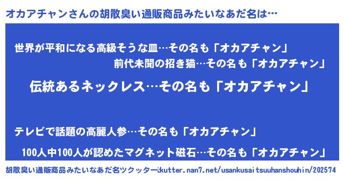 | 欧米人風あだ名 | 『アンジェラ・オカアチャン』 |
