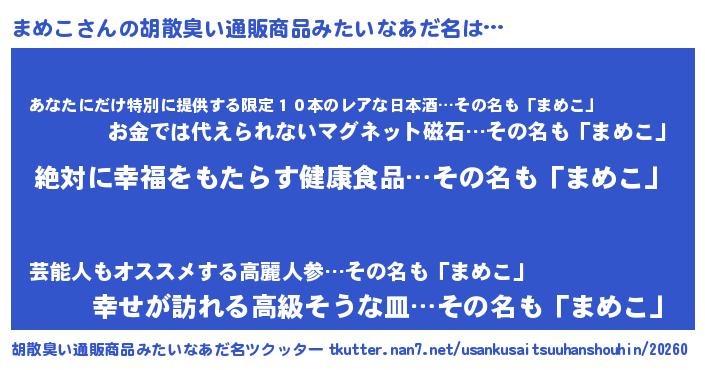 | 男性向けラノベタイトル風あだ名 | 『まめこという概念が存在しない退屈な世界 』 |