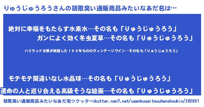 | 男性向けラノベタイトル風あだ名 | 『魔弾の王とりゅうじゅうろう』 |