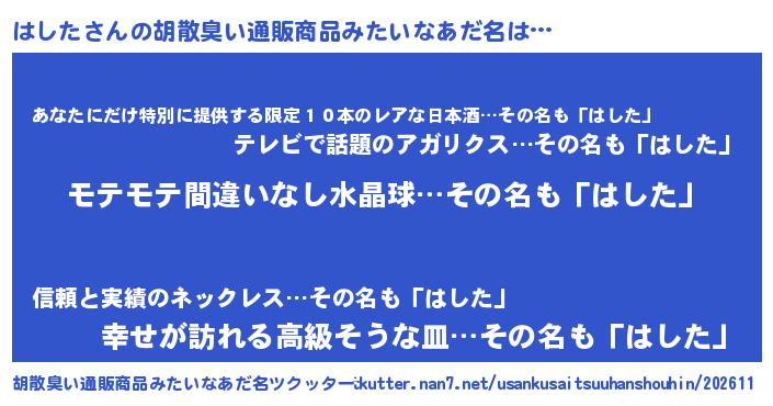| ピコ太郎風あだ名 | 『ハコ五郎』『ピハ八郎』『ハシ六郎』 |