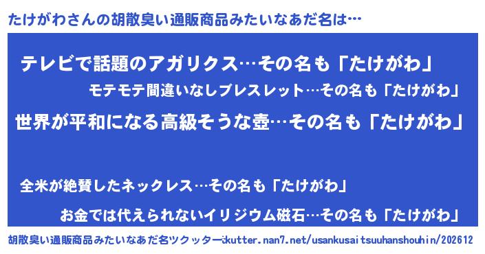 | 意味不明あだ名 | 『なめこ科たけがわ属』『自称たけがわ』 |