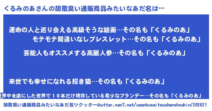 | 意味不明あだ名 | 『自称くるみのあ』『ペロリンくるみのあ』 |