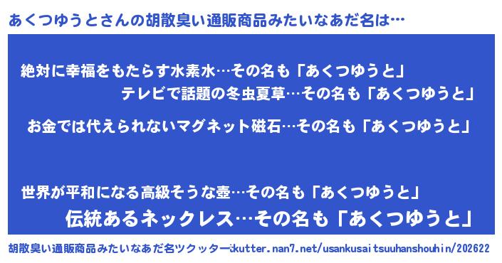 | 男性向けラノベタイトル風あだ名 | 『あくつゆうとに滅ぼされるだけの簡単なお仕事です』 |