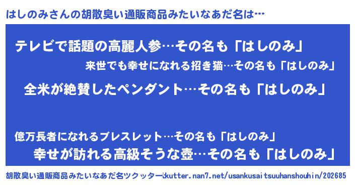 | 意味不明あだ名 | 『とにかく怪しいはしのみ』 |