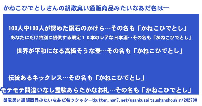 | 男性向けラノベタイトル風あだ名 | 『転生したらかねこひでとしだった件』 |