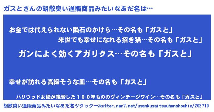 | 女子向けラノベタイトル風あだ名 | 『ガスとなんてお断りですっ。』 |