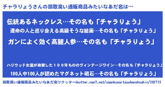 | 意味不明あだ名 | 『自称チャラりょう』 |