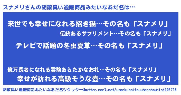 | ヒーロー風カッコイイあだ名 | 『サイバー戦士スナメリ』『ネオスナメリ』 |