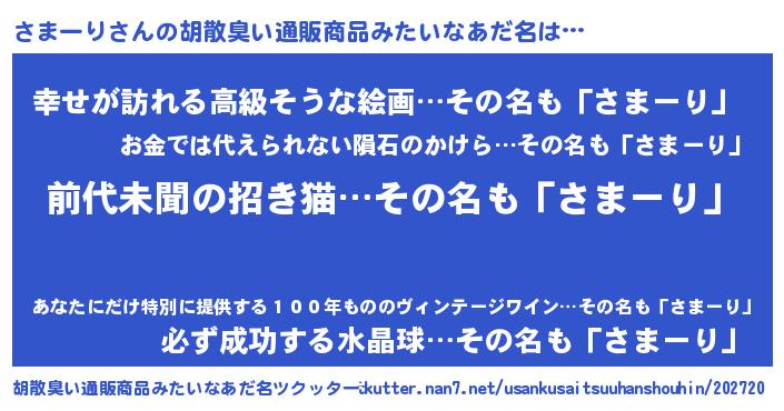 | 意味不明あだ名 | 『永久保存さまーり』『ペロリンさまーり』 |