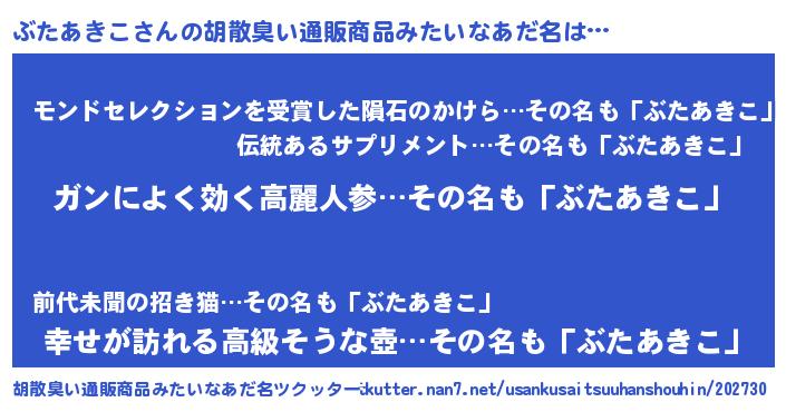 | 意味不明あだ名 | 『自称ぶたあきこ』『永久保存ぶたあきこ』 |