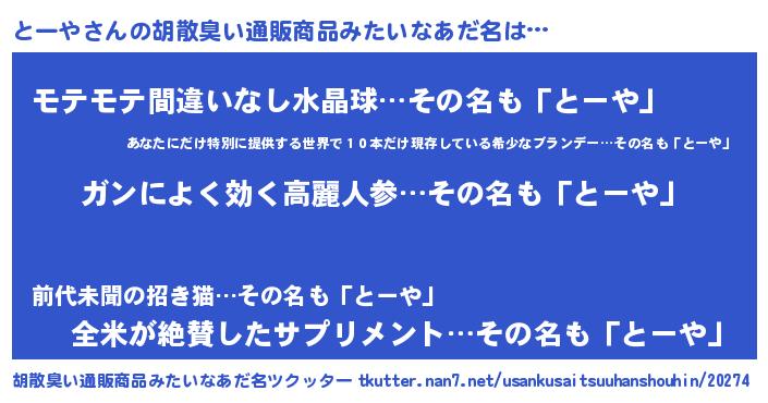 | 意味不明あだ名 | 『自称とーや』『ペロリンとーや』 |