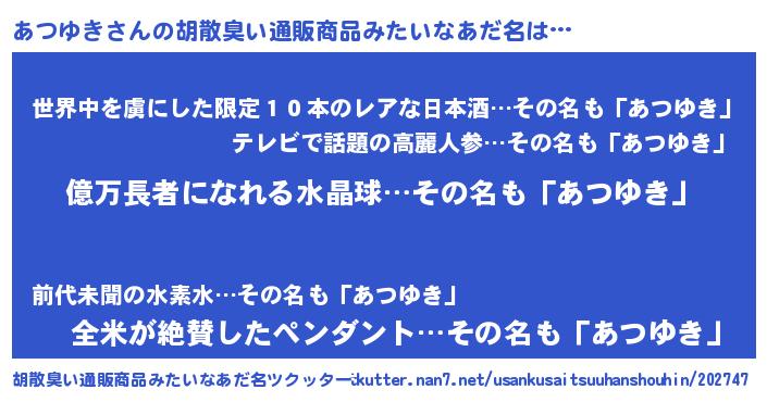 | 意味不明あだ名 | 『ペロリンあつゆき』『自称あつゆき』 |