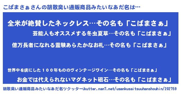| 男性向けラノベタイトル風あだ名 | 『こばまさぁ~年齢イコール彼女いない歴の魔法使い~』 |