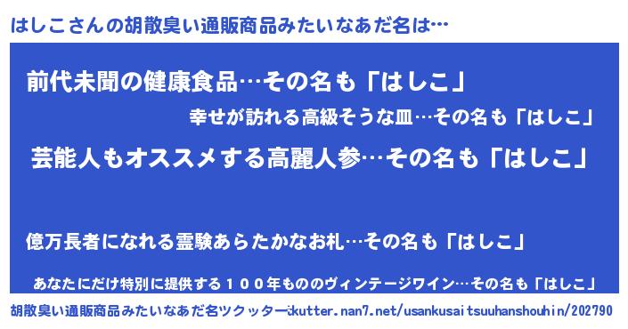 | 男性向けラノベタイトル風あだ名 | 『Re:はしこから始める異世界生活』 |