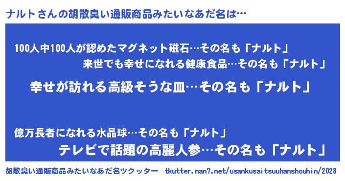 | 女子向けラノベタイトル風あだ名 | 『ナルトの雑貨屋さん』 |