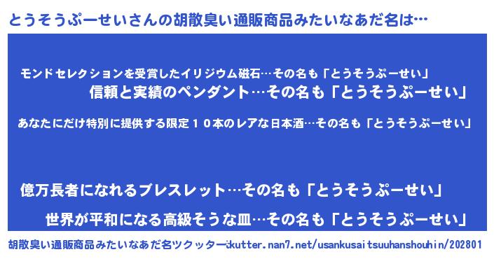 | 意味不明あだ名 | 『住所不定無職とうそうぷーせい(68歳)』 |