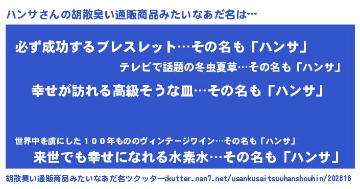 | 恥ずかしいあだ名 | 『ハンっちょ』『プリティーハンサ』 |
