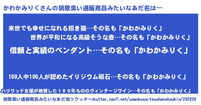 | 意味不明あだ名 | 『とにかく怪しいかわかみりく』 |