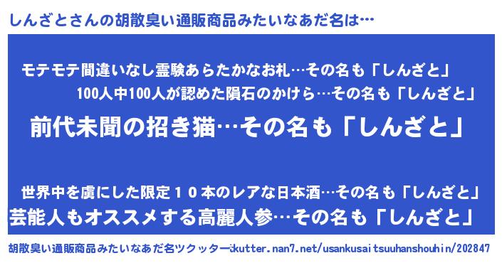 | ヘコむあだ名 | 『しんざと(笑)』『しんもー』『豆乳』 |