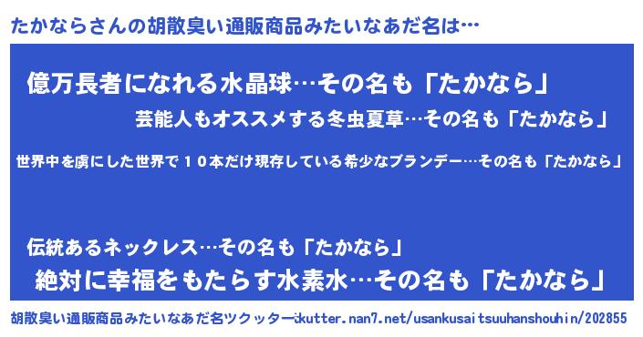 | 意味不明あだ名 | 『住所不定無職たかなら(95歳)』 |