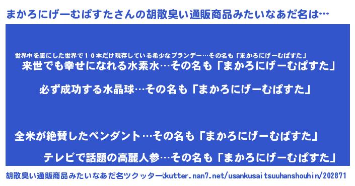 | 男性向けラノベタイトル風あだ名 | 『まかろにげーむぱすたの憂鬱』 |