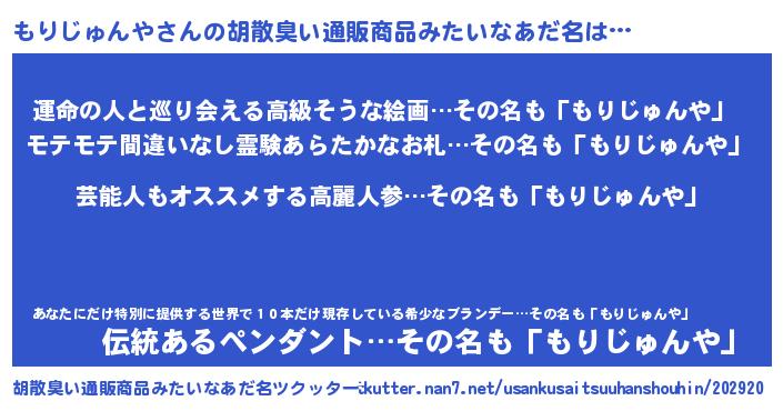 | 男性向けラノベタイトル風あだ名 | 『Re:もりじゅんやから始める異世界生活』 |