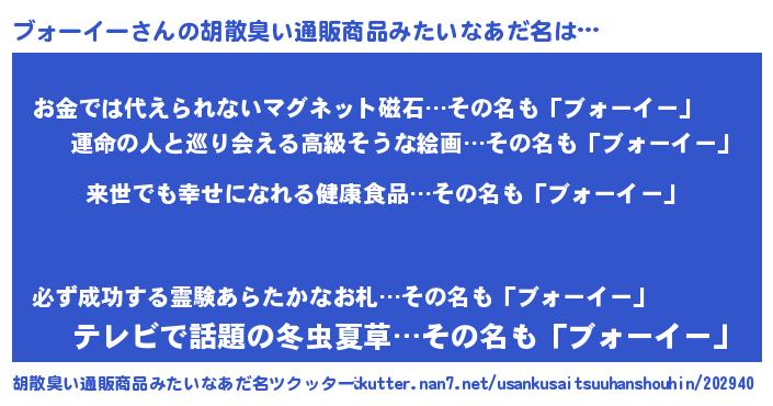 | 恥ずかしいあだ名 | 『ブォちん』『ボンバーヘッドブォ』 |