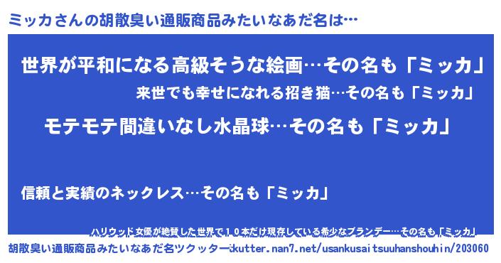 | 意味不明あだ名 | 『ペロリンミッカ』『ミッカフォーエバー』 |