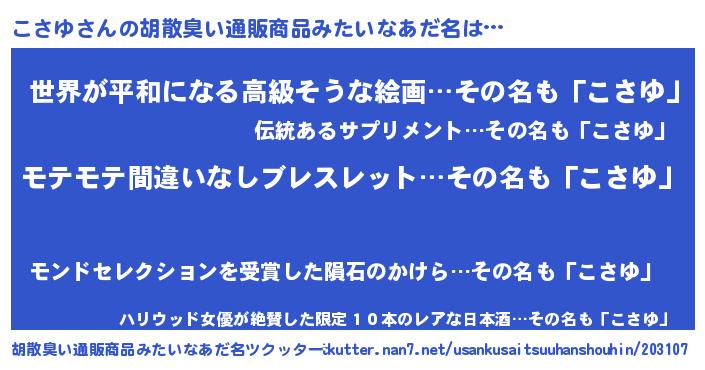 | 意味不明あだ名 | 『ペロリンこさゆ』『こさゆフォーエバー』 |