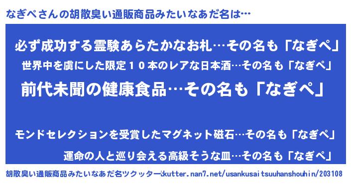 | 意味不明あだ名 | 『永久保存なぎぺ』『ペロリンなぎぺ』 |