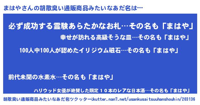 | 男性向けラノベタイトル風あだ名 | 『緋弾のマハヤ』『まはやの憂鬱』 |