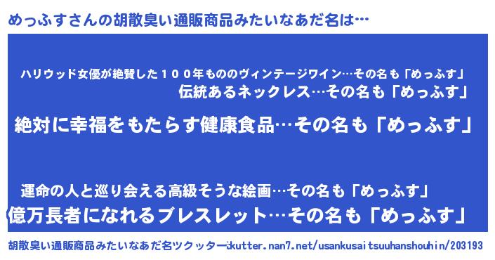 | 男性向けラノベタイトル風あだ名 | 『緋弾のメッフス』『めっふすの憂鬱』 |