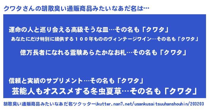 | 意味不明あだ名 | 『ペロリンクワタ』『クワタフォーエバー』 |