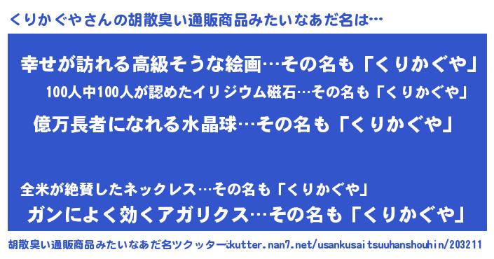| 男性向けラノベタイトル風あだ名 | 『クリカグヤアートオンライン』 |
