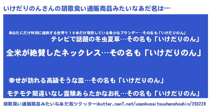 | 男性向けラノベタイトル風あだ名 | 『いけだりのん~年齢イコール彼女いない歴の魔法使い~』 |