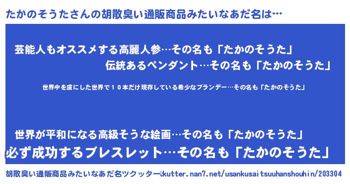| 意味不明あだ名 | 『住所不定無職たかのそうた(93歳)』 |