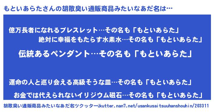 | 男性向けラノベタイトル風あだ名 | 『もといあらたの嫁は女の子じゃないと思った?』 |