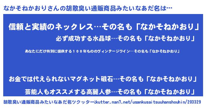 | 男性向けラノベタイトル風あだ名 | 『この素晴らしい世界になかそねかおりを!』 |
