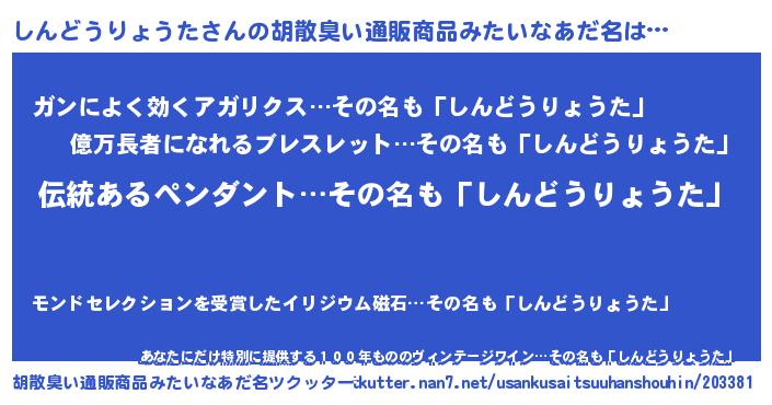 | 女子向けラノベタイトル風あだ名 | 『しんどうりょうたの玉の輿計画!』 |