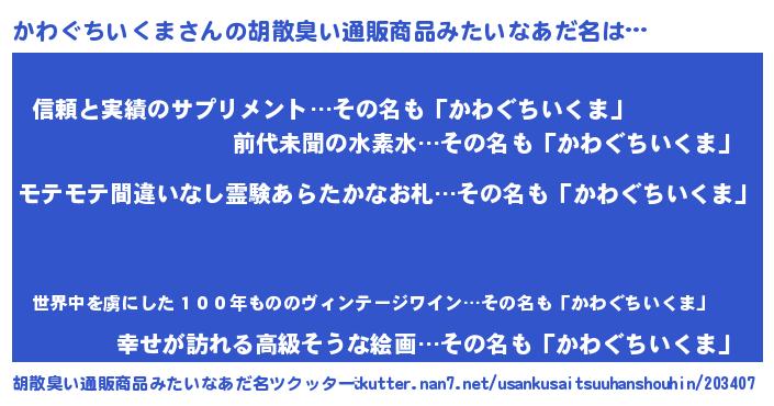 | 男性向けラノベタイトル風あだ名 | 『かわぐちいくまの憂鬱』 |