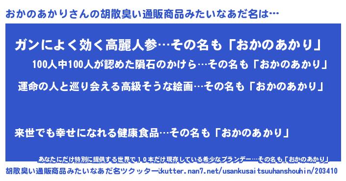 | 男性向けラノベタイトル風あだ名 | 『うちの娘の為ならば、俺はもしかしたらおかのあかりも倒せるかもしれない。』 |